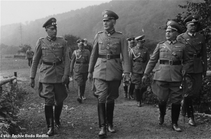 Der Reichskriegsminister (Mitte), rechts der Bataillonskommandeur, Oberstleutnant Theune,