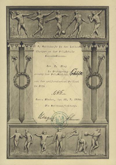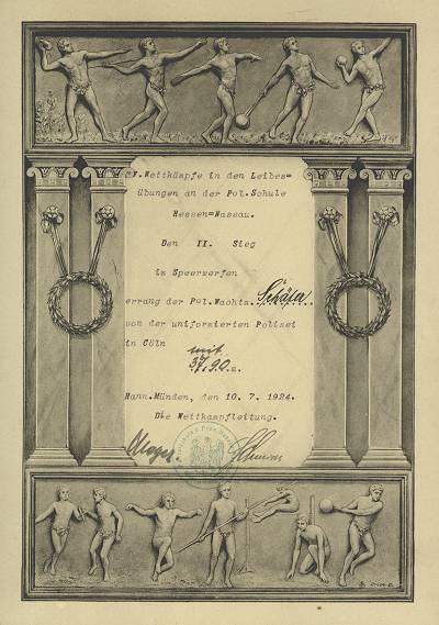 Sporturkunden, errungen 1924 vom Pol. Wachtmeister Schäfer,